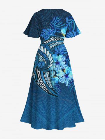 Plus Size Hibiscus Flowers Tropical Leaf Print Split Hawaii Midi Dress - Sky Blue - S