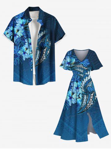 Plus Size Hibiscus Flowers Tropical Leaf Print Split Hawaii Midi Dress - Sky Blue - 1x