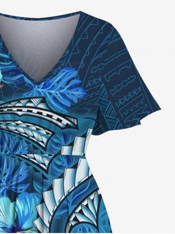 Plus Size Hibiscus Flowers Tropical Leaf Print Split Hawaii Midi Dress - Sky Blue - 3x
