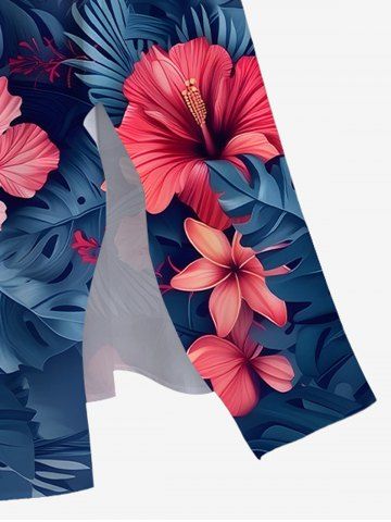 Plus Size Hibiscus Flowers Tropical Leaf Print Split Hawaii Midi Dress - Navy Blue - M