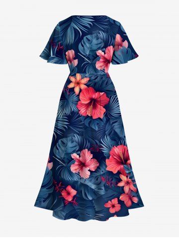 Plus Size Hibiscus Flowers Tropical Leaf Print Split Hawaii Midi Dress - Navy Blue - 6x