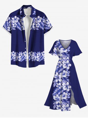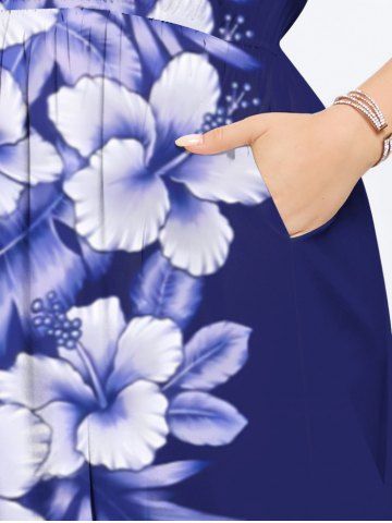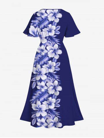 Plus Size Hibiscus Flowers Tropical Leaf Print Split Hawaii Midi Dress - Blue - S