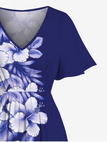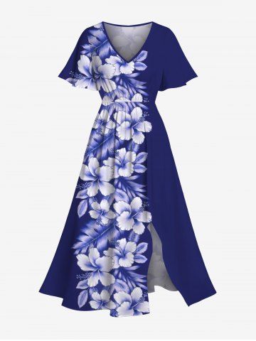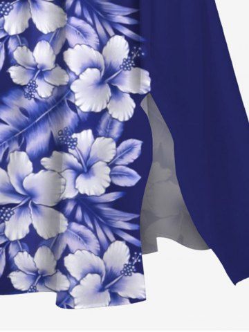 Plus Size Hibiscus Flowers Tropical Leaf Print Split Hawaii Midi Dress - Blue - 6x