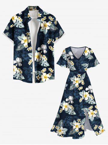 Plus Size Hibiscus Flowers Tropical Leaf Print Split Hawaii Midi Dress - Navy Blue - 1x