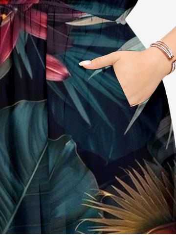 Plus Size Hibiscus Flowers Tropical Leaf Print Split Hawaii Midi Dress - Black - S