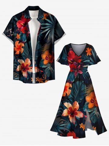 Plus Size Hibiscus Flowers Tropical Leaf Print Split Hawaii Midi Dress - Black - 1x