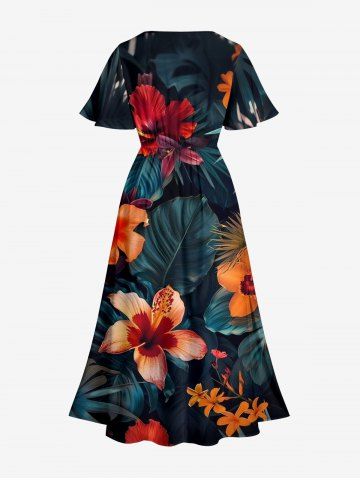 Graphic Dresses > Plus Size Hibiscus Flowers Tropical Leaf Print Split Hawaii Midi Dress