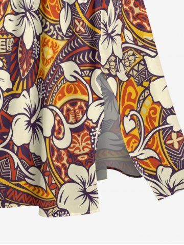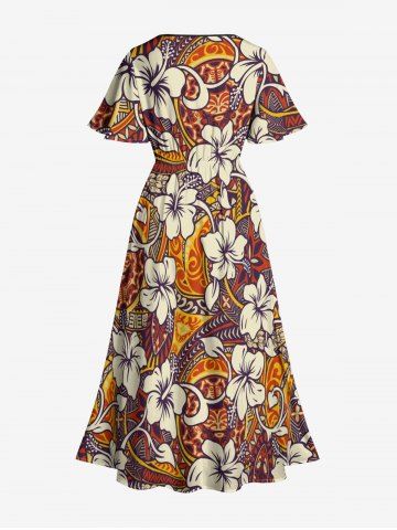 Plus Size Hibiscus Flowers Tropical Print Split Hawaii Midi Dress - Brown - S