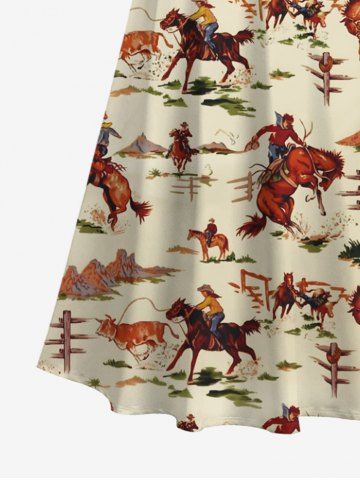 Plus Size Horse Rider Print Hawaii Western Cowboy Style Cold Shoulder Crisscross Strappy A Line Maxi Dress - Light Coffee - M