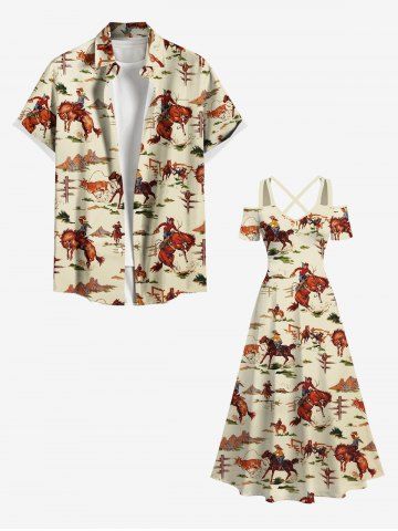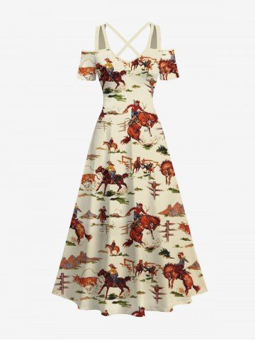 Graphic Dresses > Plus Size Horse Rider Print Hawaii Western Cowboy Style Cold Shoulder Crisscross Strappy A Line Maxi Dress