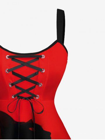 Plus Size Ink Painting Cat Print Halloween Lace Up A Line Tank Dress - Red - 2x