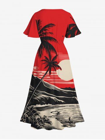 Plus Size Ink Painting Coconut Tree Mountain Sea Moon Print Hawaii Split Pocket A Line Midi Dress - Red - L