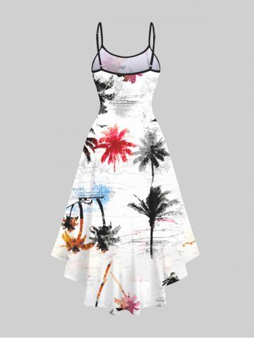 Plus Size Ink Painting Colorful Coconut Tree Print Hawaii High Low Asymmetric Cami Dress - Crystal Cream - 1x
