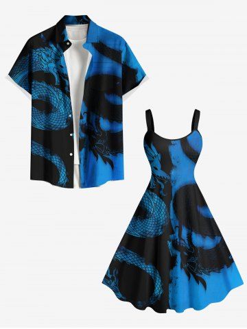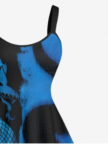 Plus Size Ink Painting Dragon Two Tone Print Hawaii A Line Tank Dress - Blue - 2x