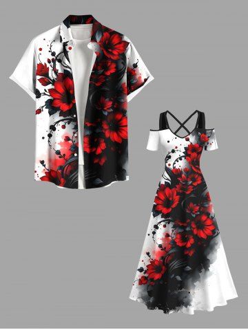 Plus Size Ink Painting Flowers Leaf Print Cold Shoulder Crisscross Hawaii Maxi Dress - Black - M