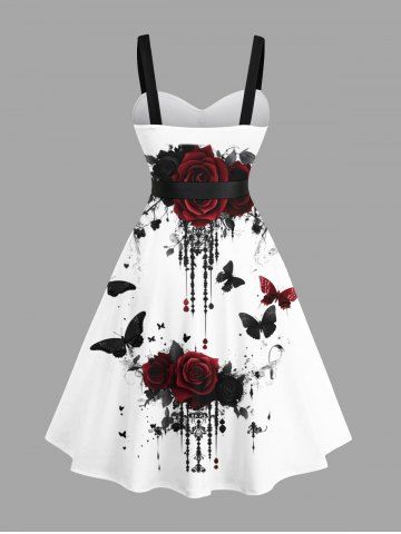 Plus Size Ink Painting Rose Flower Tassel Butterfly Print Halloween Button A Line Dress with Removable Belt - White - 3x