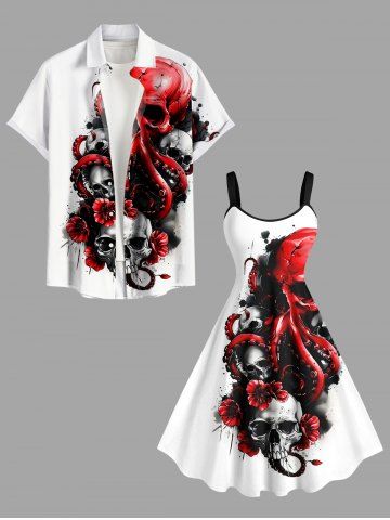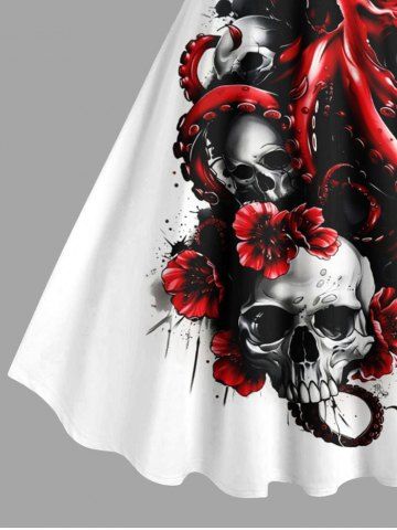 Plus Size Ink Painting Skull Octopus Flower Print Halloween A Line Tank Dress - White - M