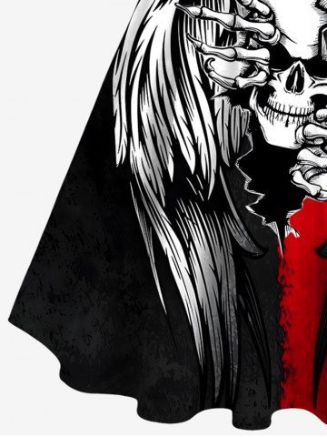 Plus Size Ink Painting Skull Ripped Two Tone Feather Wings Print Halloween Costume Button A Line Dress with Removable Belt - Red - S