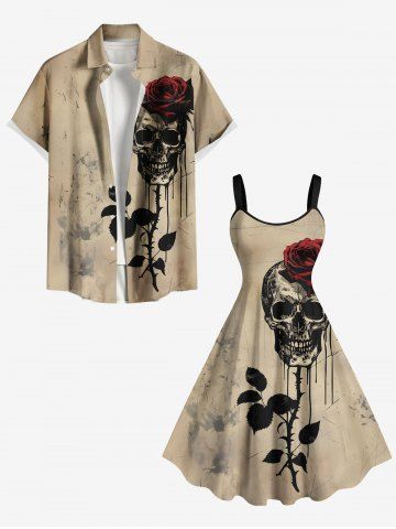 Plus Size Ink Painting Skull Rose Flower Leaf Print Halloween A Line Tank Dress - Light Coffee - 5x