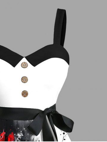 Plus Size Ink Painting Splatter Rose Flower Print Halloween Button A Line Dress with Removable Belt - Black - 5x