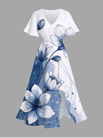 Plus Size Ink Painting Watercolor Flower Print Hawaii Split Pocket A Line Midi Dress - Blue - 5x