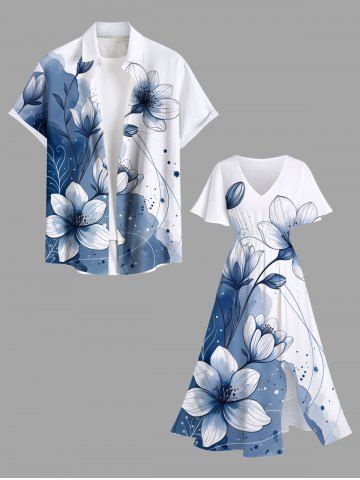 Plus Size Ink Painting Watercolor Flower Print Hawaii Split Pocket A Line Midi Dress - Blue - 6x