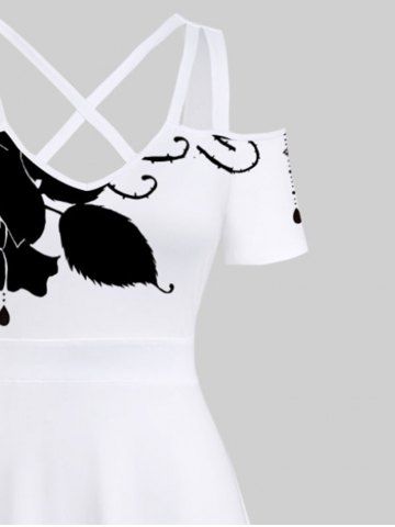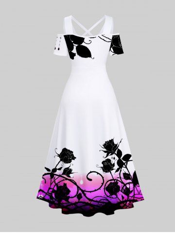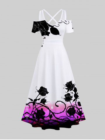 Plus Size Ink Rose Flower Leaf Vine Print Hawaii Ombre Crisscross A Line Maxi Dress - White - 2x