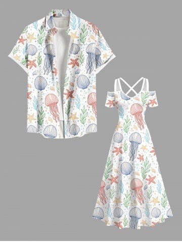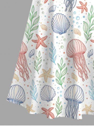 Plus Size Jellyfish Shell Starfish Leaf Print Cold Shoulder Crisscross Hawaii Maxi Dress - White - 2x