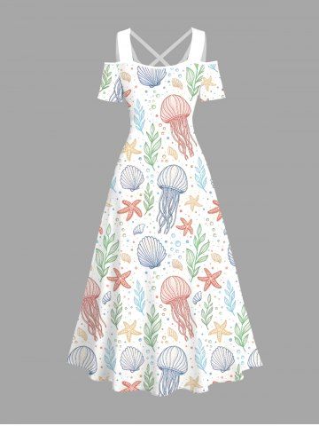 Plus Size Jellyfish Shell Starfish Leaf Print Cold Shoulder Crisscross Hawaii Maxi Dress - White - 5x