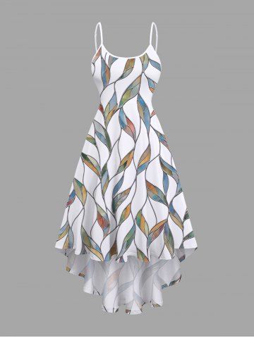 Plus Size Leaf Branch Colorblock Print Hawaii High Low Asymmetric Cami Dress - White - 3x