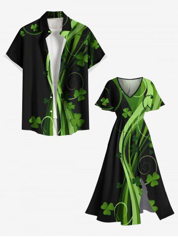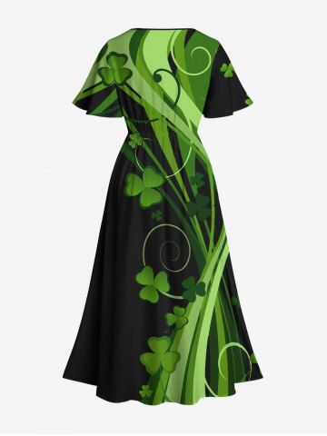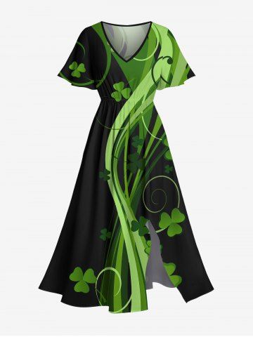 Plus Size Leaf Clover Curve Print St. Patrick's Day Hawaii Split Pocket A Line Midi Dress - Black - Xxs