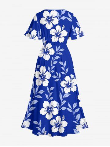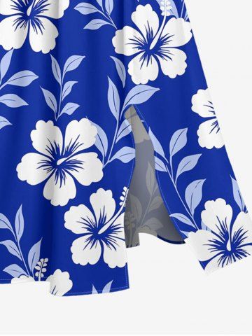 Plus Size Leaf Hibiscus Flower Branch Print Hawaii Split Pocket A Line Midi Dress - Blue - M