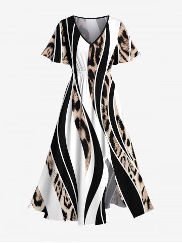 Graphic Dresses > Plus Size Leopard Curve Colorblock Print Hawaii Split Pocket A Line Midi Dress