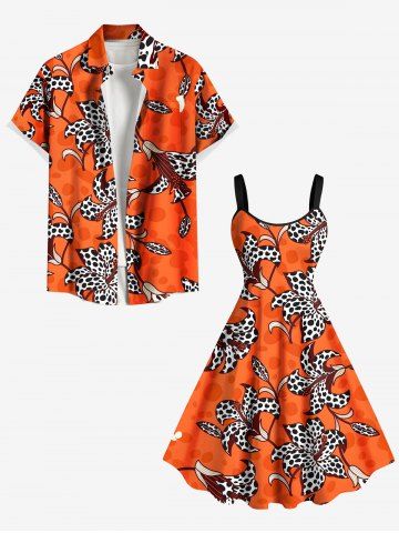 Plus Size Leopard Hibiscus Flower Leaf Print Hawaii A Line Tank Dress - Orange - M