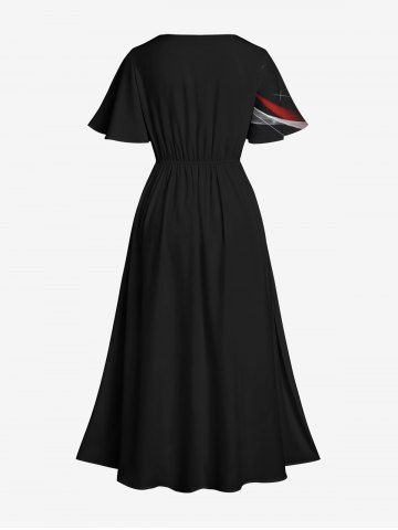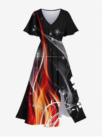Plus Size Light Beam Floral Fire Flame Print Hawaii Split Pocket A Line Midi Dress - Black - 4x