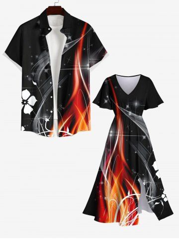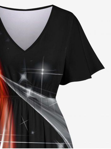 Plus Size Light Beam Floral Fire Flame Print Hawaii Split Pocket A Line Midi Dress - Black - 6x