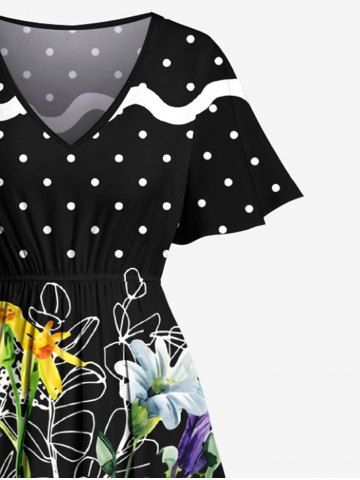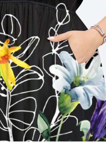 Plus Size Lily Flower Branch Spotted Pin Dot Print Hawaii Split Pocket A Line Midi Dress - Black - Xs