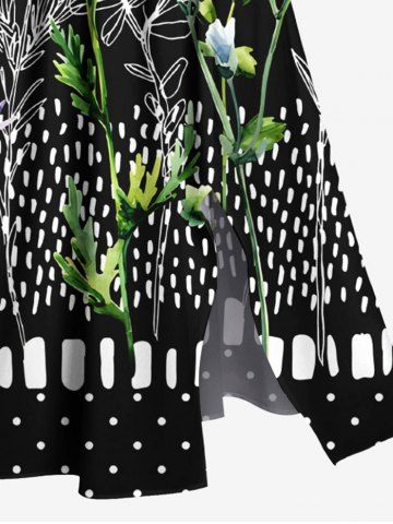 Plus Size Lily Flower Branch Spotted Pin Dot Print Hawaii Split Pocket A Line Midi Dress - Black - M