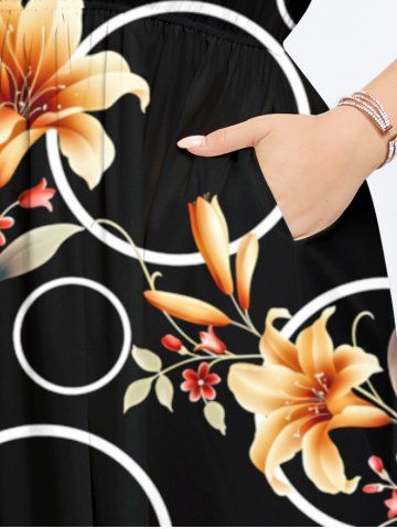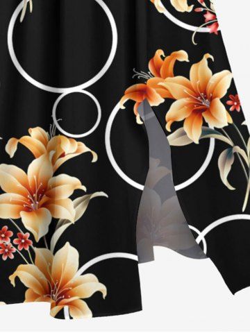Plus Size Lily Flower Bubble Print Hawaii Split Pocket A Line Midi Dress - Black - 2x
