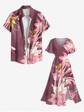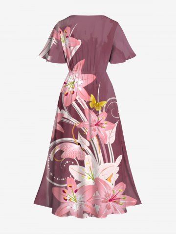 Graphic Dresses > Plus Size Lily Flower Butterfly Curve Print Hawaii Split Pocket A Line Midi Dress