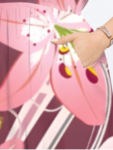 Plus Size Lily Flower Butterfly Curve Print Hawaii Split Pocket A Line Midi Dress - Light Pink - L