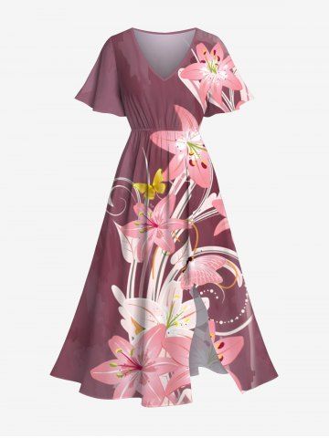 Plus Size Lily Flower Butterfly Curve Print Hawaii Split Pocket A Line Midi Dress - Light Pink - 1x