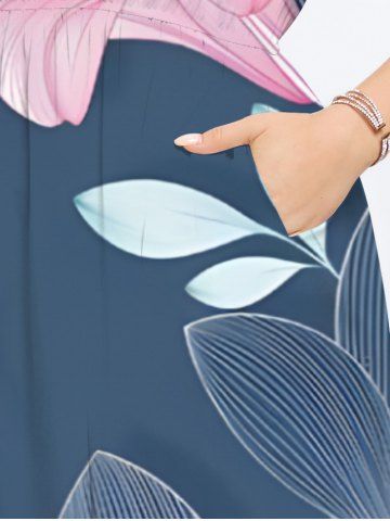 Plus Size Lily Flower Leaf Bird Print Hawaii Split Pocket A Line Midi Dress - Blue - S