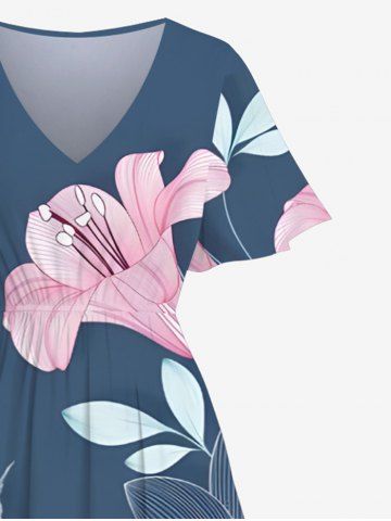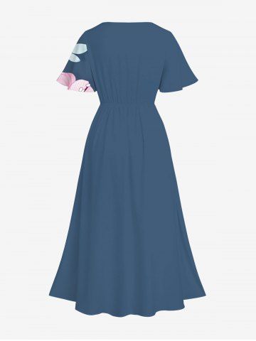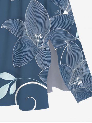 Plus Size Lily Flower Leaf Bird Print Hawaii Split Pocket A Line Midi Dress - Blue - 3x