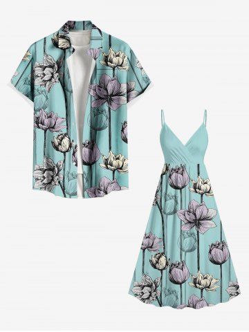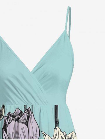 Plus Size Lotus Flower Print Hawaii Surplice A Line Cami Dress - Light Green - S