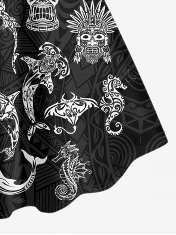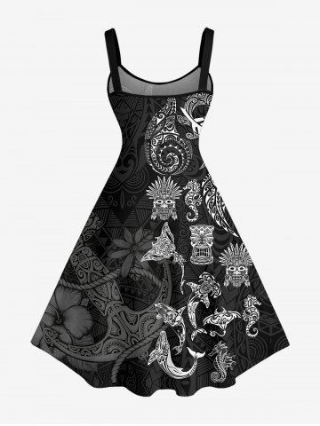 Plus Size Masks Fish Butterfly Sea Horse Ethnic Pattern Print Hawaii Tank Dress - Black - S
