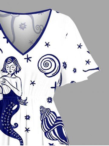 Plus Size Mermaid Shell Conch Print Hawaii Split Pocket A Line Midi Dress - White - 5x