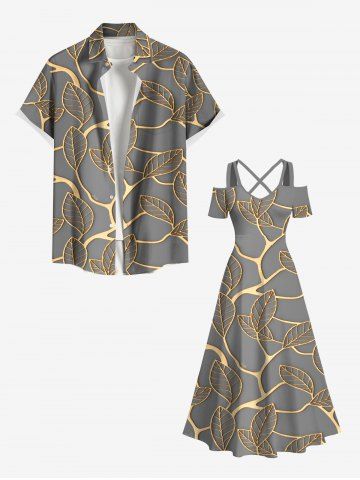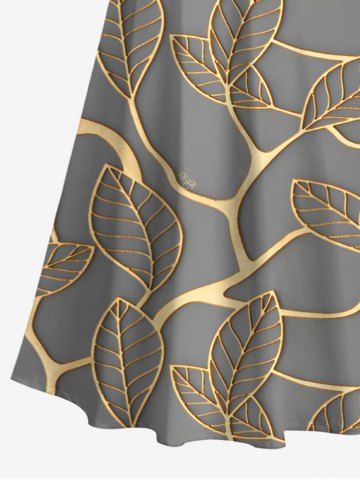Plus Size Metallic Leaf Print Cold Shoulder Crisscross Hawaii Maxi Dress - Gray - S