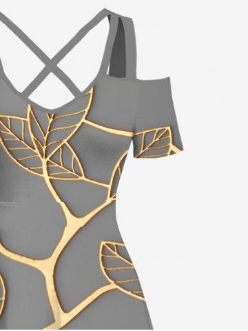 Plus Size Metallic Leaf Print Cold Shoulder Crisscross Hawaii Maxi Dress - Gray - 1x