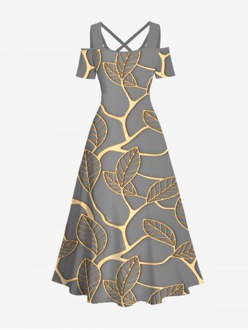 Plus Size Metallic Leaf Print Cold Shoulder Crisscross Hawaii Maxi Dress - Gray - 2x